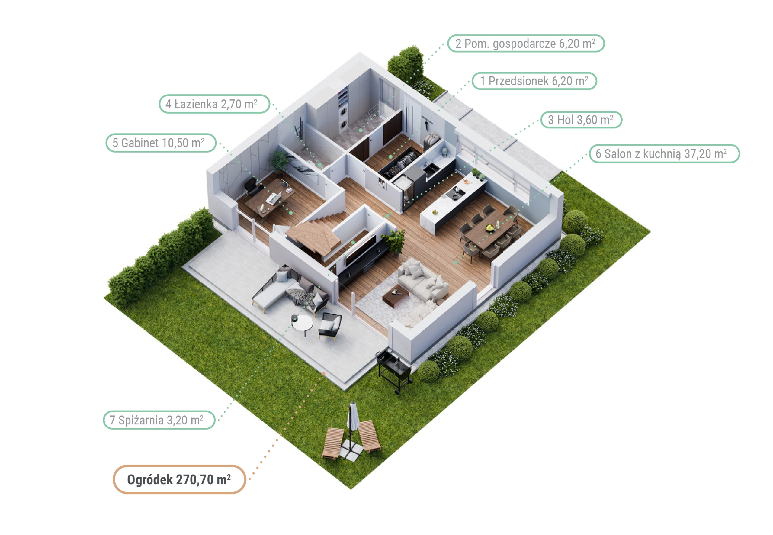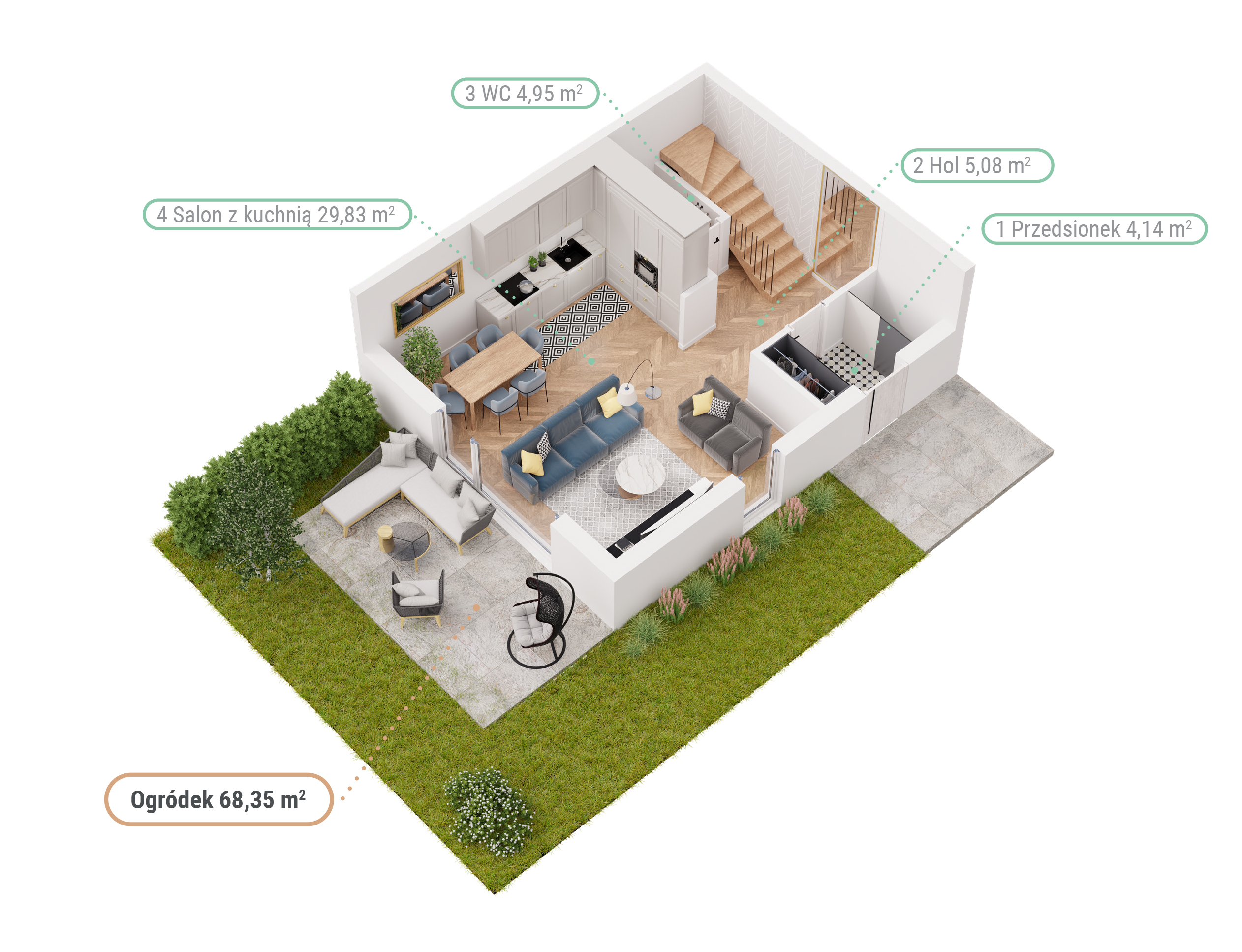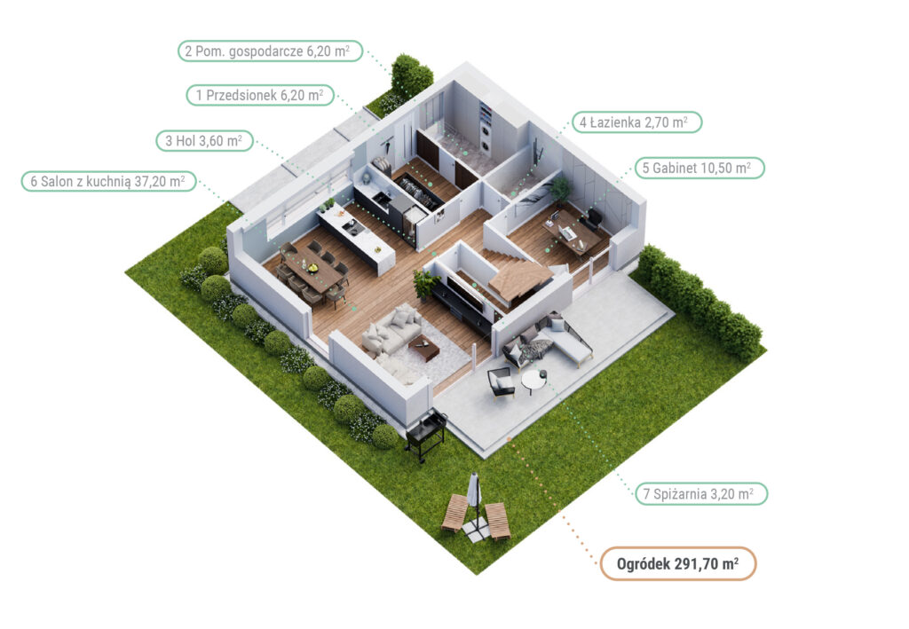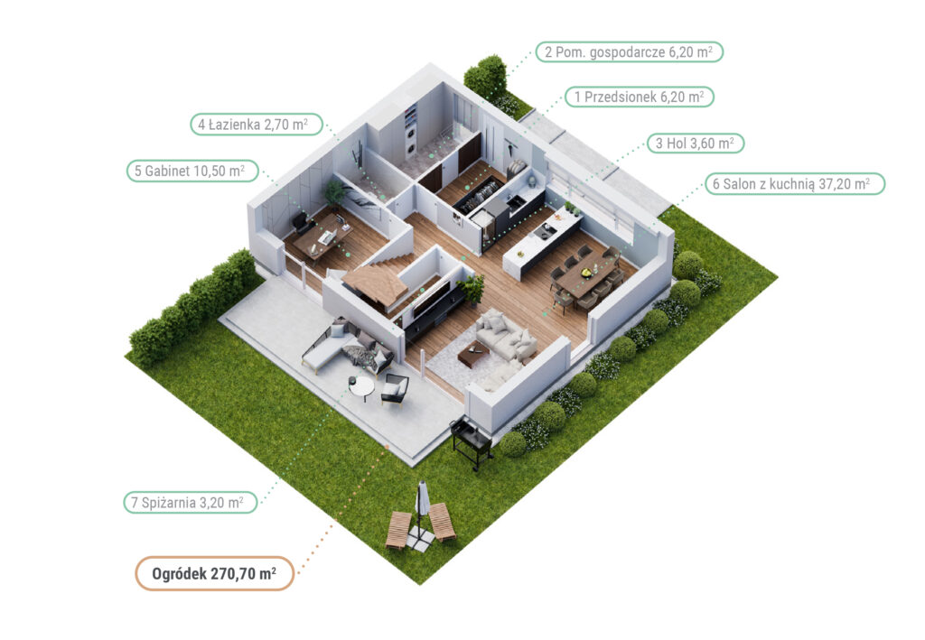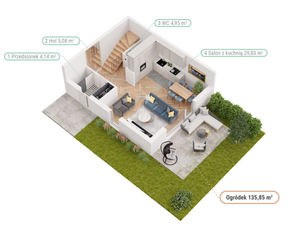Na tyłach domów usytuowane są prywatne ogródki o powierzchni od 70 m² do 140 m², które zapewniają przestrzeń do relaksu i aktywności na świeżym powietrzu. Przemyślany układ domów gwarantuje komfort mieszkańcom. To idealne miejsce do życia na co dzień.