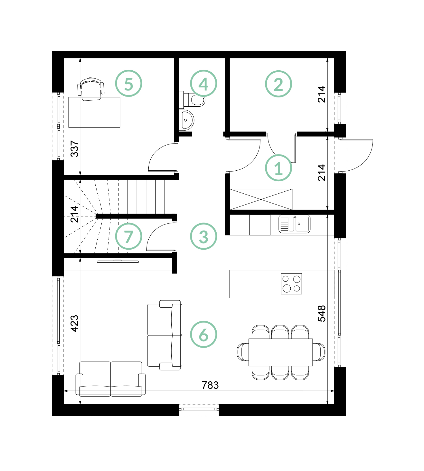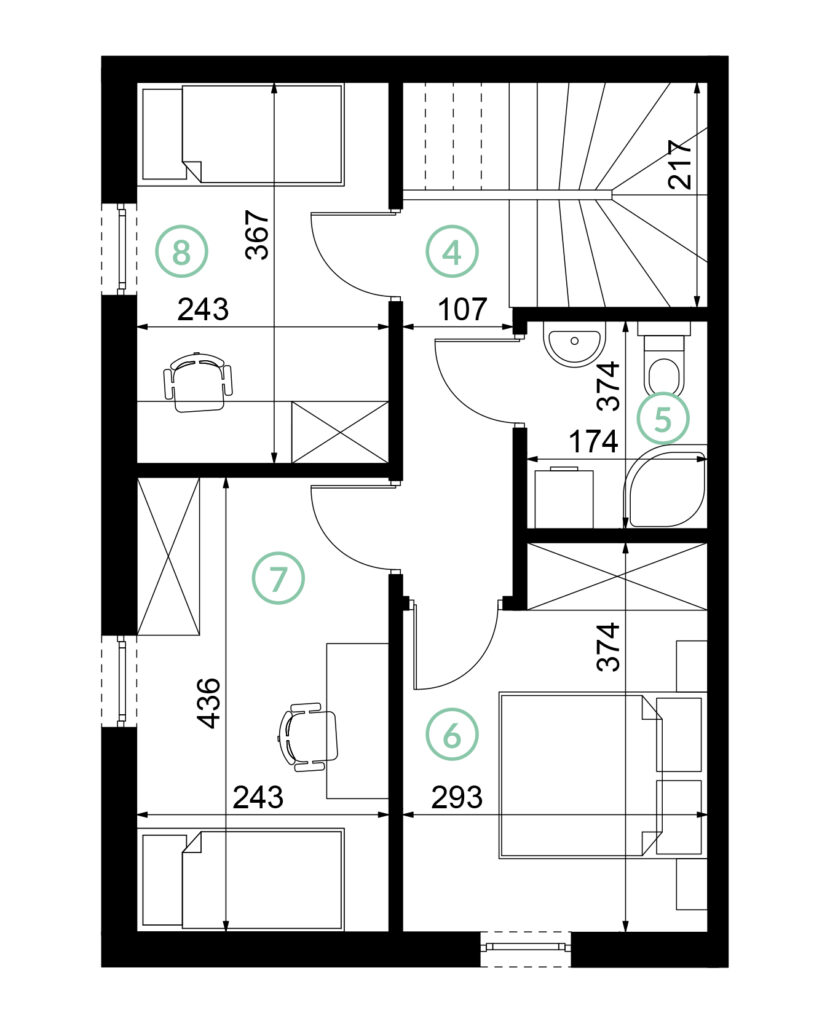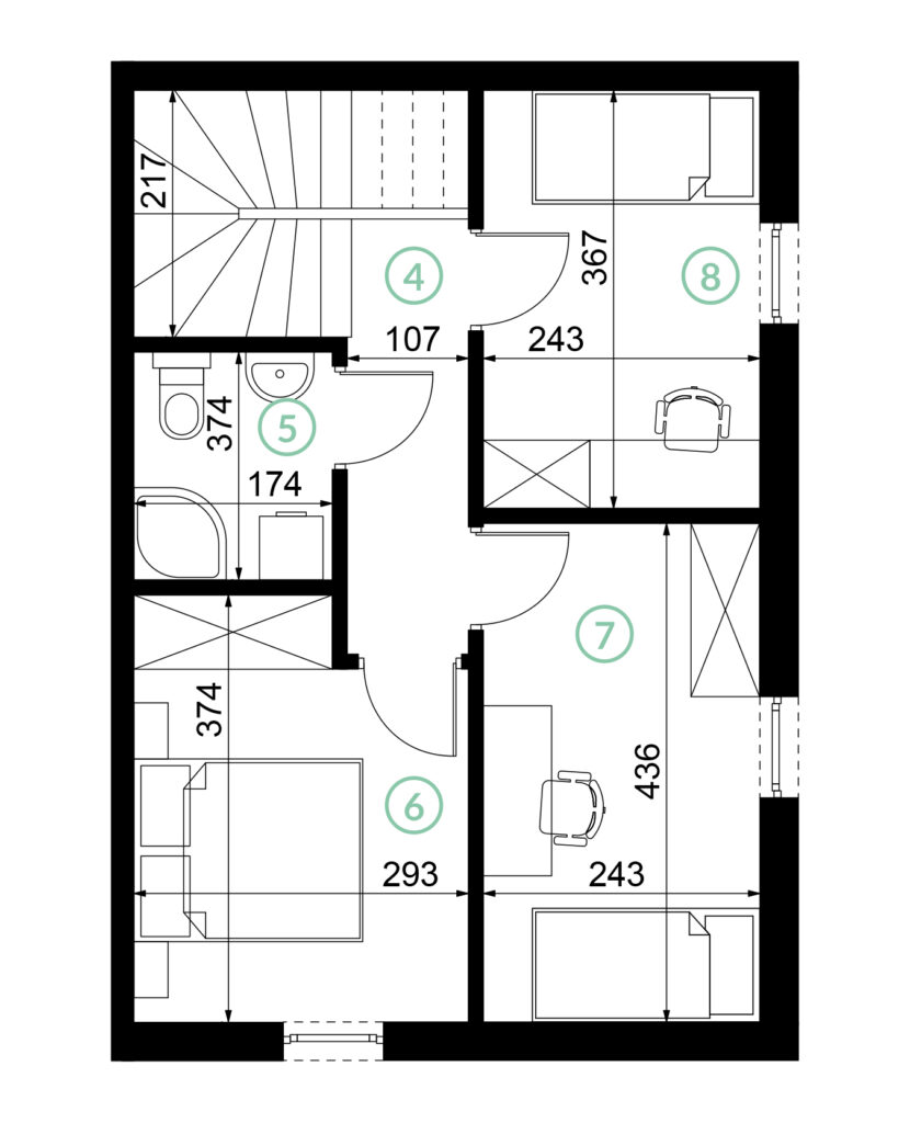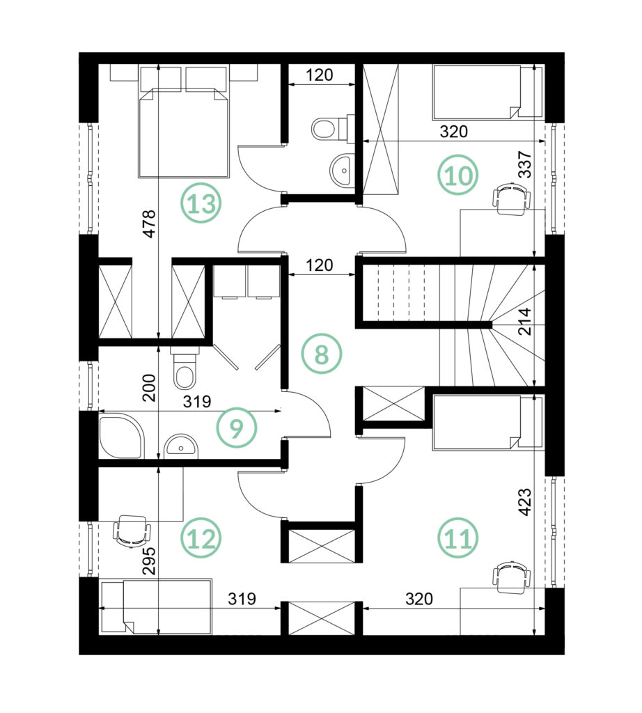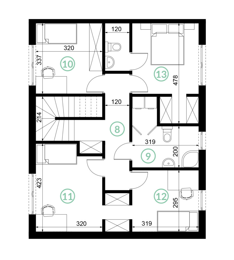 Wnętrza domów zaprojektowano z myślą o komforcie i elastyczności – wysokie pomieszczenia bez skosów na parterze i piętrze optycznie zwiększają przestrzeń. Dodatkowo poddasze o powierzchni 40 m² daje możliwość indywidualnej aranżacji i znaczącego powiększenia powierzchni użytkowej. Na początkowym etapie budowy dopuszczamy zmiany usytuowania ścian działowych, tak by można dostosować układ pomieszczeń do własnych potrzeb. Duże okna zapewniają doskonałe doświetlenie w każdym pomieszczeniu.
